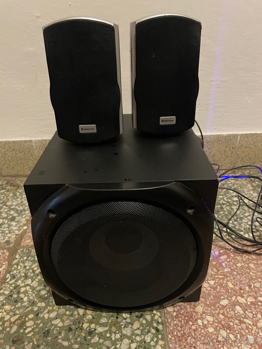 Prodám 2 malé reproduktory společně se subwooferem značky Defender. Společně vytvoří maximální výkon 80W. Ideální pro garáž/zahradu. Reproduktory jsou staršího data, čemuž odpovídá i vizuální stav, avšak jsou plně funkční.