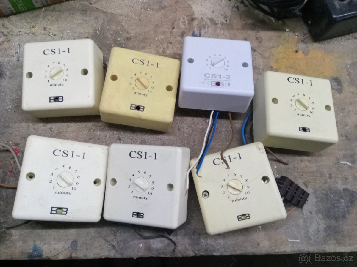 Časový spínač CS1-1 může ovládat ventilátory (pro odvětrání koupelny), WC a jiných prostor. Starší verze provedení.