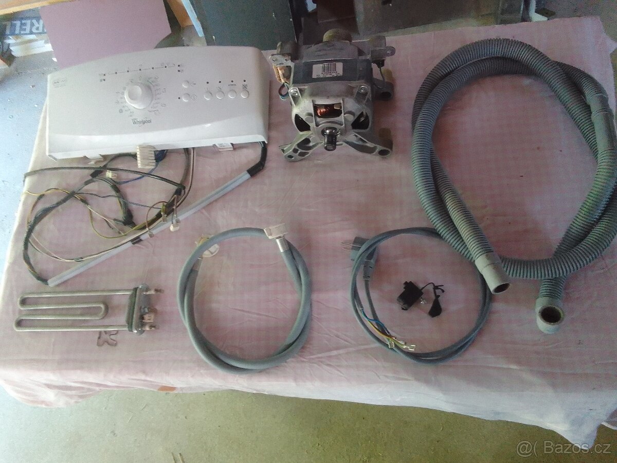 Pračka Whirlpool AWE 4519 díly. Vše funguje a je nepoškozené. Hlavní panel s řídící deskou a elektroinstalací , napouštěcí a odtoková trubka, topná spirála, motor + řemínek, přívodní elektrická šňůra. POUZE VOLEJTE