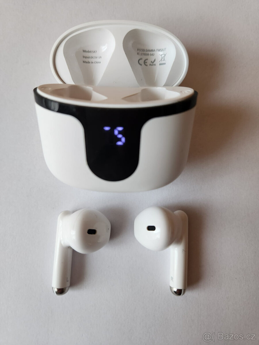 Bluetooth sluchátka S47 s nabíjecím pouzdrem s digitálním displejem - bílá, vhodná pro sport-výborně drží v uchu, ultralehká 3.8 g, výdrž cca 5H, nabíjení 2hod., frekvenční rozsah 20Hz-20kHz, verze Bluetooth: V5.3,