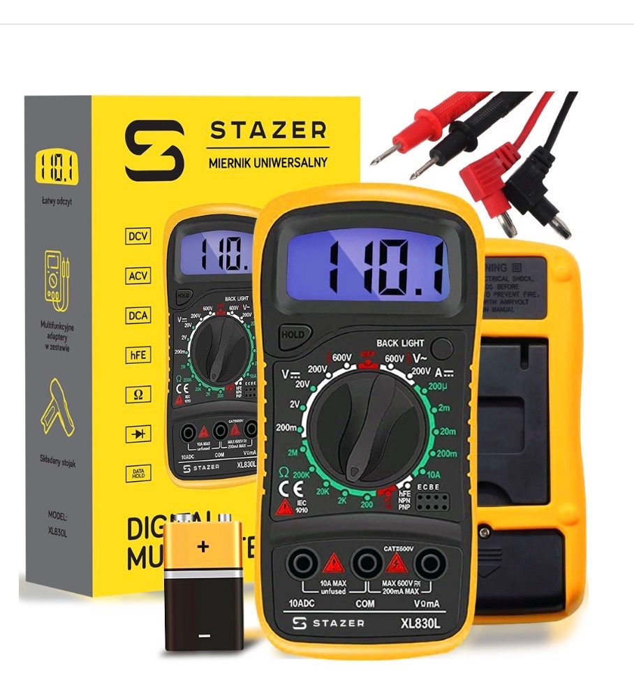 Je vysoce kvalitní produkt, který se skvěle hodí jak pro pokročilou elektroniku, tak pro amatéry. Disponuje indikátorem slabé baterie a nastavitelnou opěrkou, která výrazně usnadňuje čtení výsledků. Měřič je vybaven odolným gumovým krytem, automatickým vypínačem podsvícení účinně zabraňujícím vybití baterie, funkcí zapamatování posledního měření - tlačítkem HOLD. Součástí balení jsou měřicí kabely a baterie, díky kterým je měřič po zakoupení připraven k provozu.