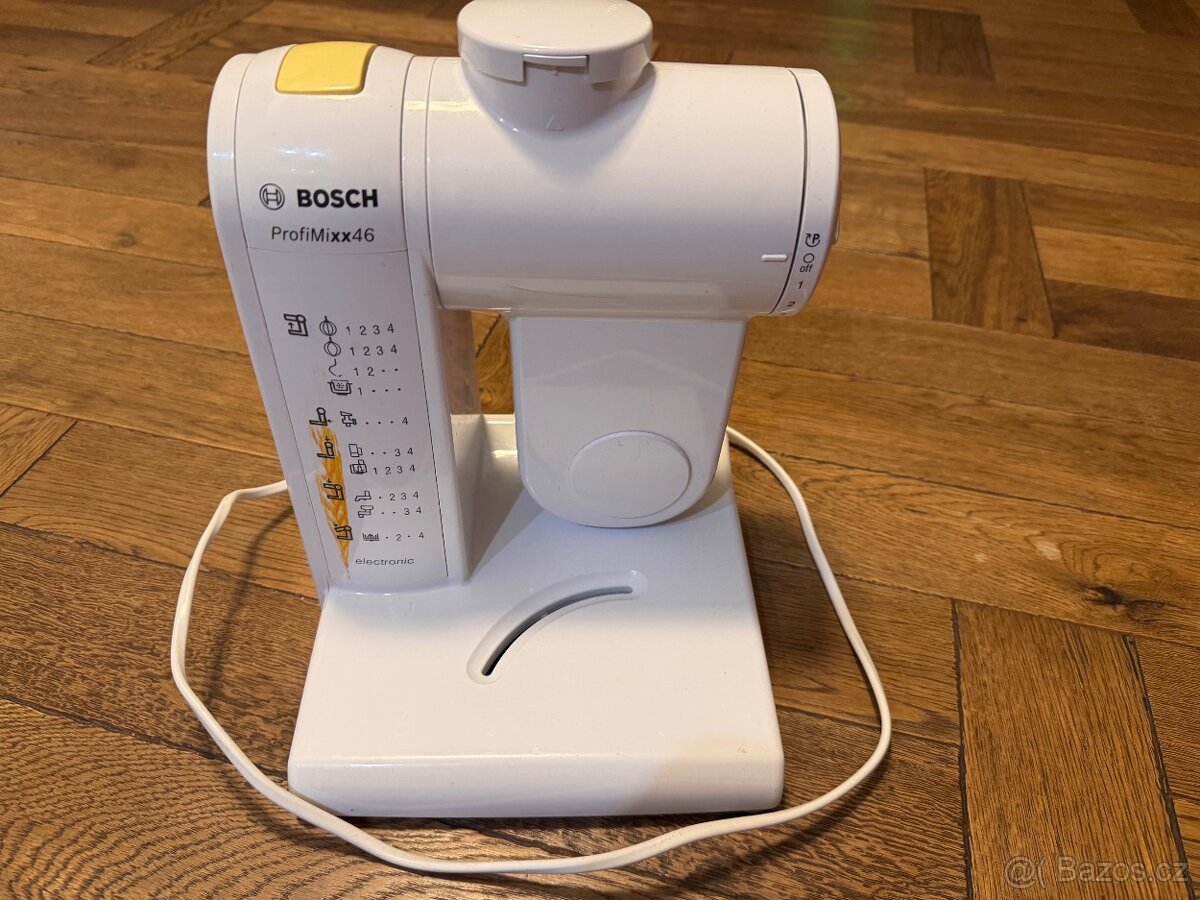 Prodám multifunkční kuchyňský robot Bosch MUM4655EU. Vhodný na šlehání, míchání, hnětení, mixování, krájení, strouhání i mletí masa. Výkonný motor 550 W, 4 stupně rychlosti, planetární míchání. Velká plastová mísa 3,9 l (až 2,7 kg těsta) s víkem a plnicím otvorem.