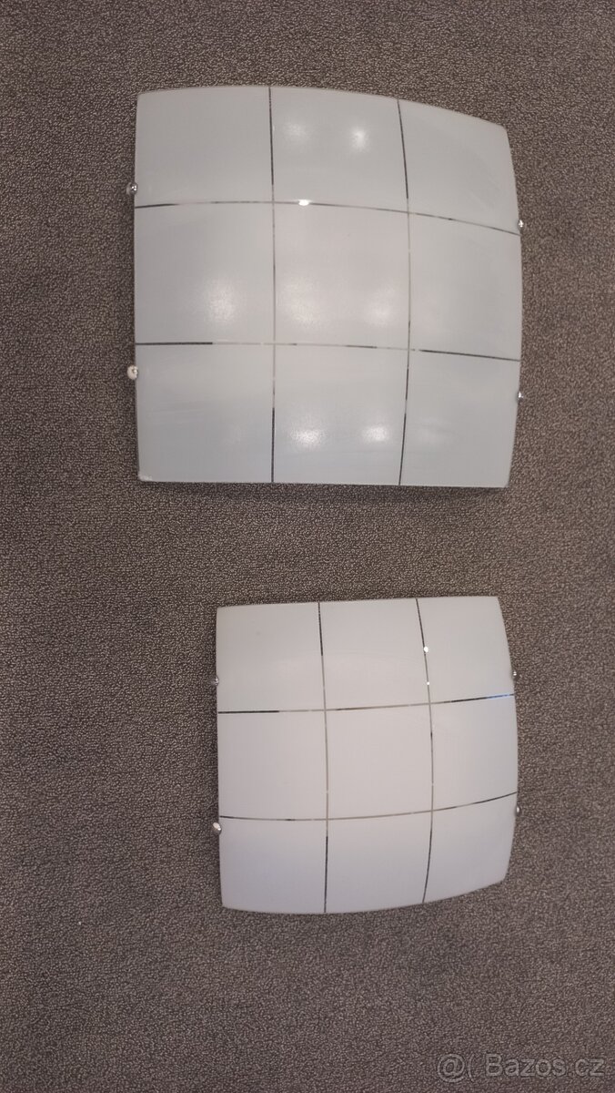 Krásná svítidla čtvercového tvaru - mléčné sklo s čirými pruhy. 2 x menší s 1 žárovkou pro max.100W a 1 x větší se dvěma žárovkami. Ideální do chodby či haly.