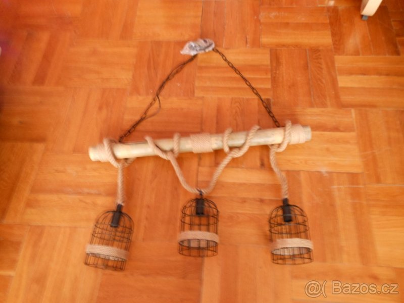 Prodám nový, nepoužitý ručně vyrobený venkovský lustr WEST NINTH. Pravý bambusový stvol a přírodním konopným provazem ručně opletené el. rozvody do tvaru lan. Rozměry: 100 cm x 50 cm. Patice E 27 3x, max. 60 W.