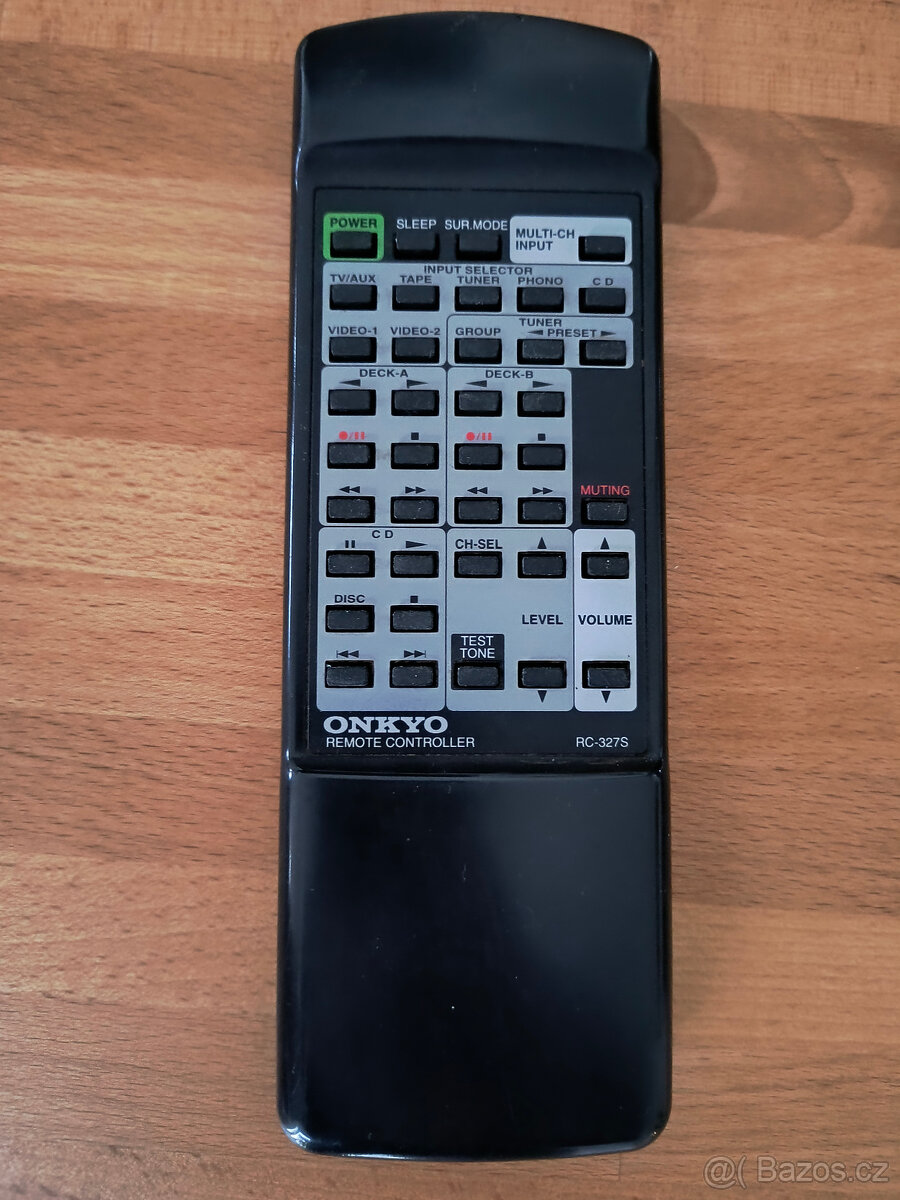 Prodám systémový dálkový ovladač Onkyo RC-327S. Původně od receiveru 5.1, ale fungoval mi spolehlivě i pro stereo zesilovač A-8850 (pak jsou pojmenované jinak některé vstupy a některé části ovladače pro vícekanál prostě jen nic nedělají). V případě propojení zesilovače s dalšími komponentami ovládádacím kabelem je možno skrze zesilovač ovládat i tyto komponenty (mám vyzkoušeno s CD).