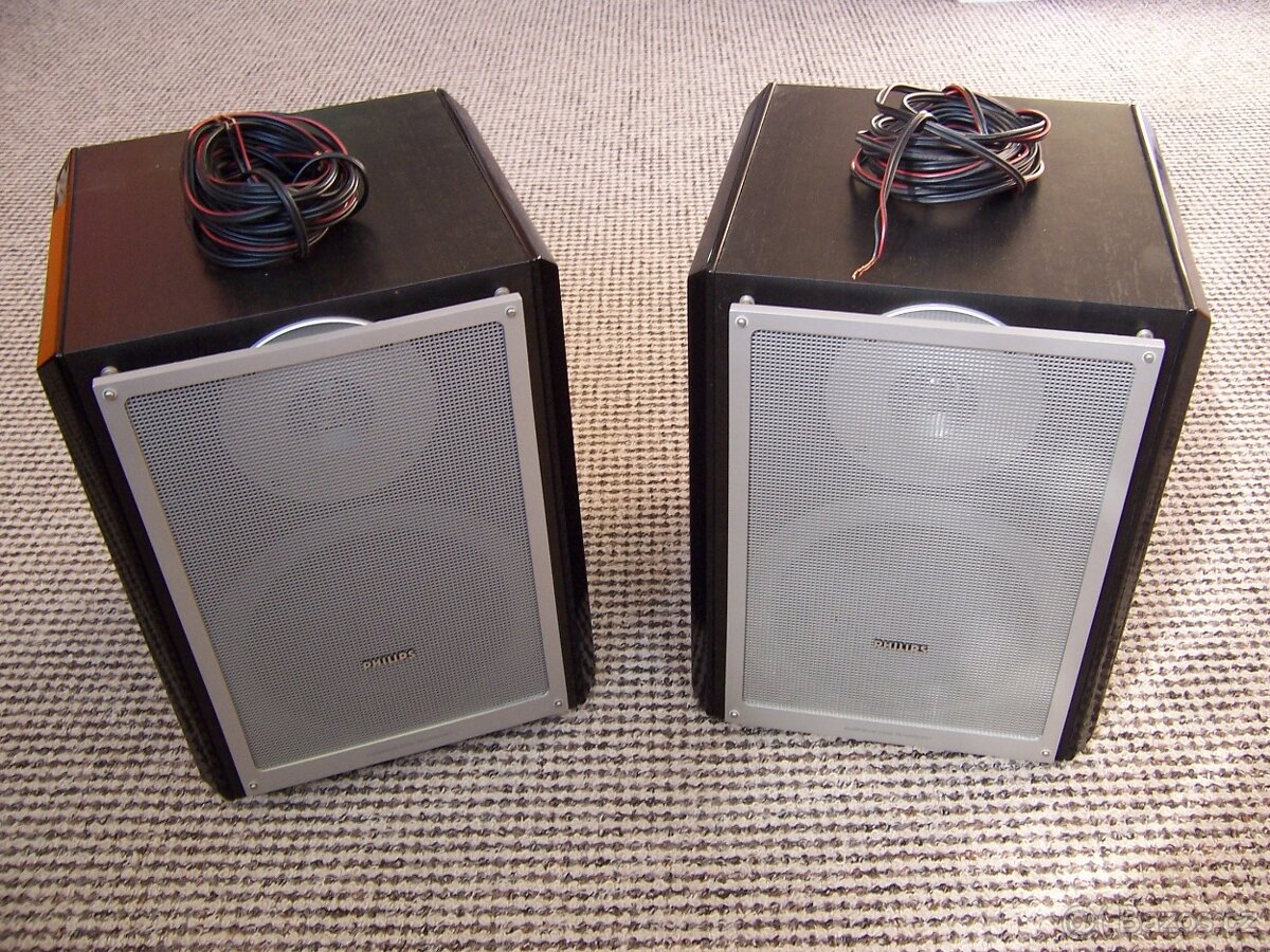 Prodám dvoupásmové reprobedny Philips. Rozměr v32cm,š25cm,h27cm. RMS 2x50W. Impedance 6 ohm. Zachovalé plně funkční.