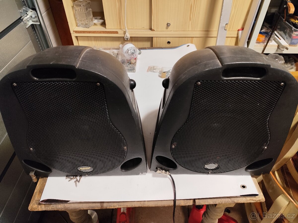 Hudební sestava 2ks reproduktory se stojany, mixážní pult se zesilovačem a propojovacími kabely,vše lze zabalit pro přepravu viz. foto.