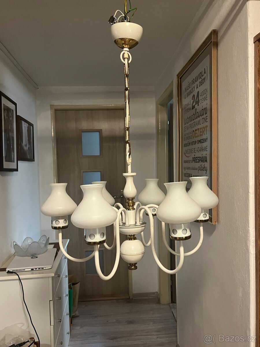 šestiramenný starý lustr, žárovky se závitem E14, jedna z objímek se bude muset asi opravit