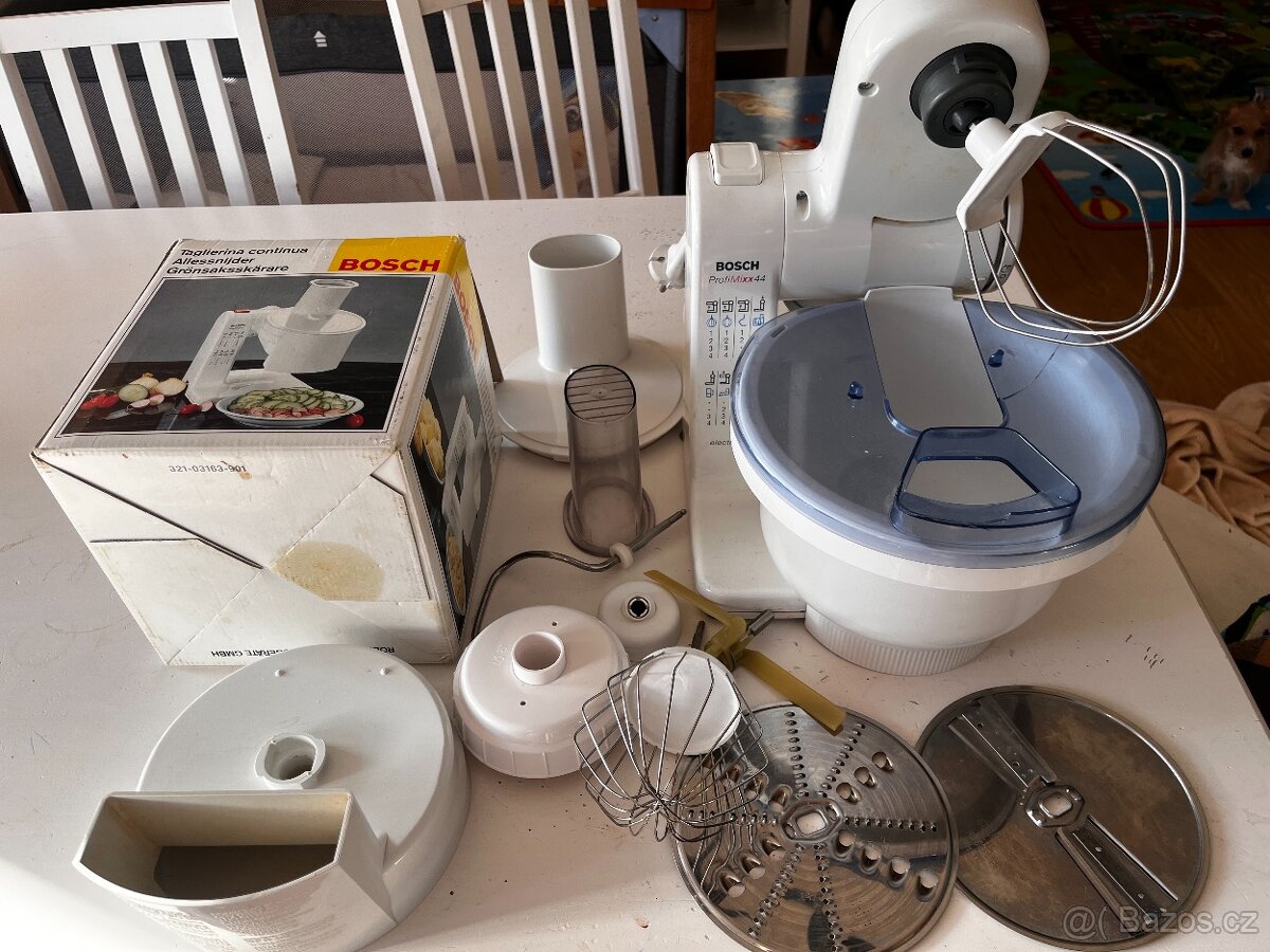 Prodám zachovaly kuchyňský robot Bosch, plně funkční(pouze naprasklé víko-viz foto), včetně příslušenství