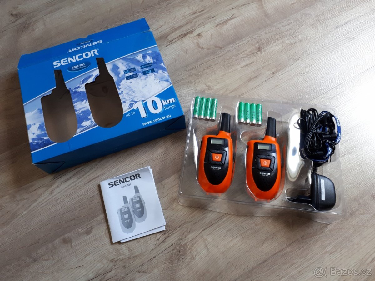 Osobní mobilní radiostanice SENCOR SMR 500. Dosah až 10 km v závislosti na dosahu a terénu. Až 304 kombinací kanálů. Podsvícený displej. Technologie VOX-handsfree konverzace. Funkce svícení, atd., viz foto. K dispozici dvě sady. Zabaleno v originálni krabici, nepoužité. Cena 1000,- Kč.