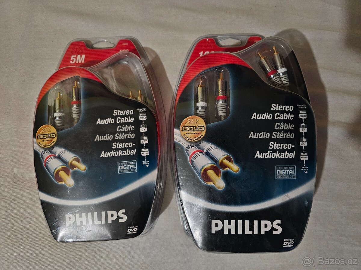Prodám úplně nový, nerozbalený audio, stereo 24k kabel Philips. První balení obsahuje 5m kabely. Druhé balení 10m kabely. Cena za 5m - 290 Kč. Cena za 10m - 390 Kč.
