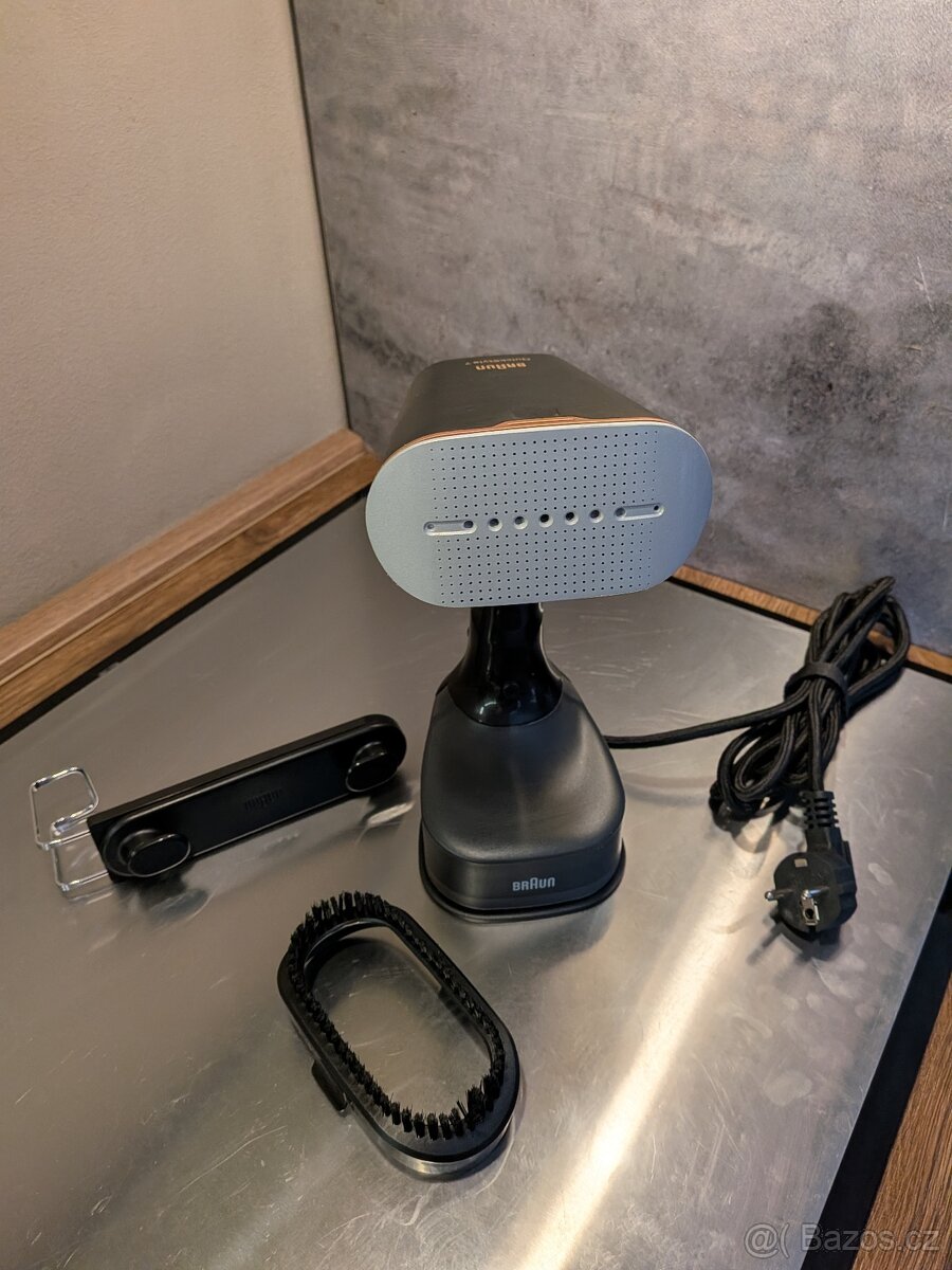 Braun quickstyle 7 -napařovač oděvů vertikální, příkon 1600 W, parní výkon 35 g/min, rychlé nahřátí, 3D žehlení, automatické nastavení teploty a vertikální napařování, vyjímatelná nádržka na vodu, použití vody z kohoutku a indikace vodního kamene, anti-drip systém (proti odkapávání) a automatické vypnutí, kartáč a nástavce součástí, materiál žehlicí plochy keramika, ohřev vody uvnitř žehličky, objem nádržky 250 ml, délka kabelu 3 m. Použito dvakrát.