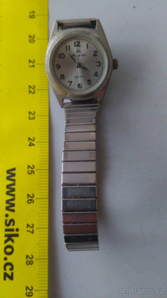 Prodám náramkové hodinky AMANDO, průměr 1,8cm, řetízek mírně poškozený, viz. Foto, nálezový stav. Cena 49,- Kč plus doprava. Možnost osobního předání Dejvice, Veleslavín, Hostivice. V případě zájmu prosím piště na registr001@centrum.cz