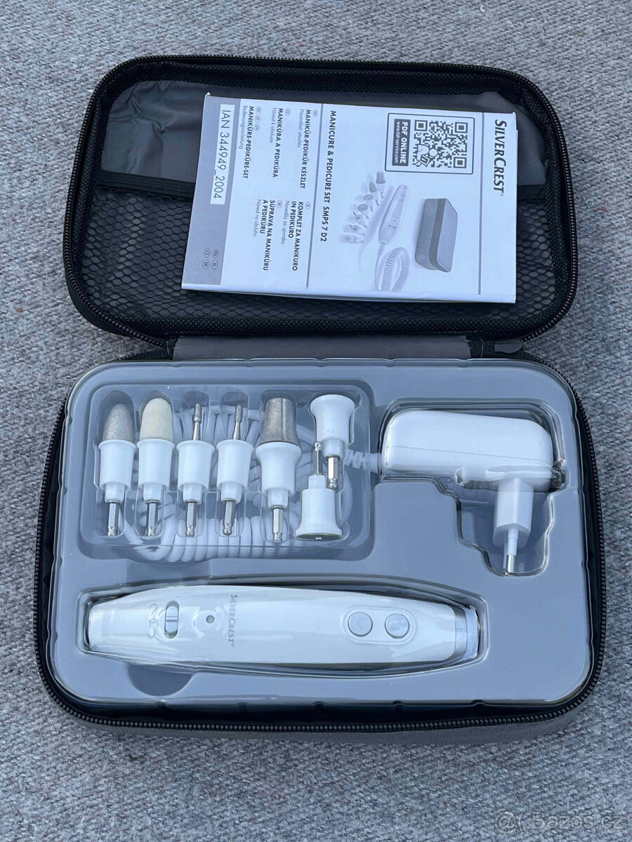 Sada je vhodná pro komplexní péči o ruce a nohy. Obsahuje 7 kvalitních hrotů ze safíru a plsti k pilování, leštění a vyhlazování nehtů. Regulované otáčky 2000 – 4600 ot./ min, směr otáčení vpravo/vlevo, pohodlné držení, napájení ze sítě.