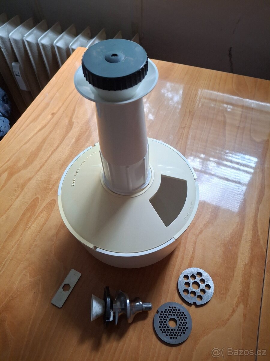 Prodám nepoužitý kompletní Strojek na mletí masa 0225 k mixéru Eta 0010 včetně šneku, šroubu, nože, 3 destiček a hřídele, bez mísy. Cena 500 Kč.