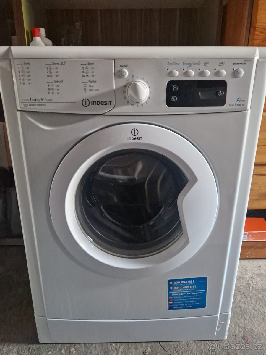 Úzká pračka zn. Indesit.S hadicí na vodu.Hloubka pračky je 43cm.Funkční. Na 6kg prádla.