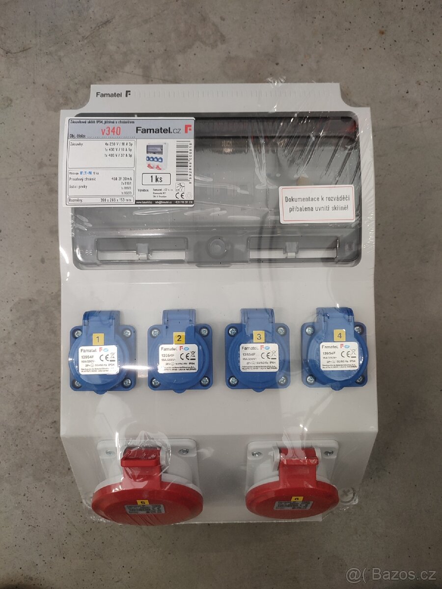 Zásuvková skříň FAMATEL v340-ZSF40101000.1 /3959 IP54 jištěná s chráničem 40/4/003-A, zásuvky 4x230V, 1x16/5, 1x32/5, přístroje EATON 10kA: 2xPL7-B16/1, 1xPL7-B16/3, 1xPL7-B32/3, PF7-40/4/003-A na vstupu, použité pouzdro: 3959 - 398x266x153mm, barva: světle šedá.