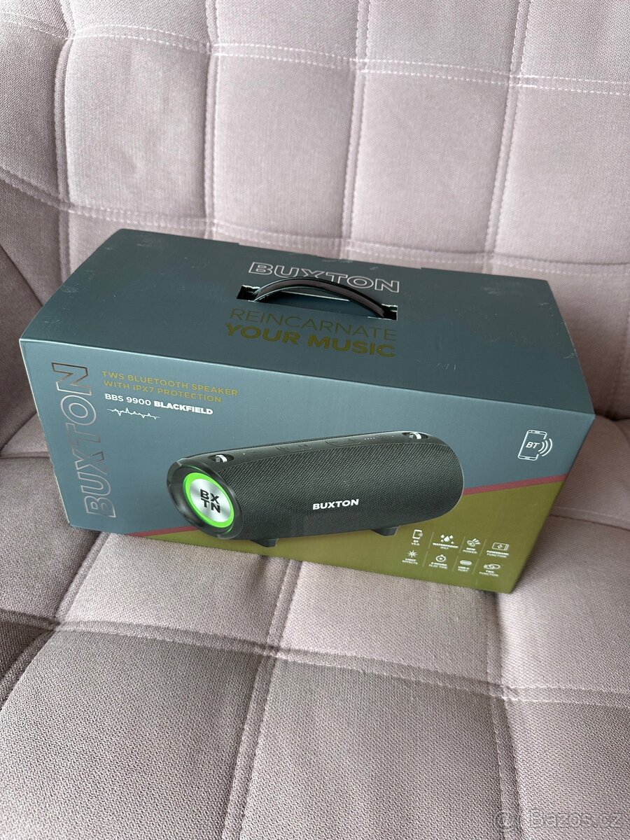 Prodám reproduktor Buxton, nevhodný dárek k Vánocům, jako nový - pouze rozbalený. Rozměry Bluetooth reproduktoru Buxton jsou 14,2 × 31 × 13,7 cm (vך×h). Obsah balení: reproduktor, popruh, USB-A - USB-C napájecí kabel, mono jack 3,5mm (TS) audio kabel, návod. Výkon 80 W, frekvence s rozpětím od 60 do 20000 Hz. Vnitřní baterie má kapacitu 4400 mAh.