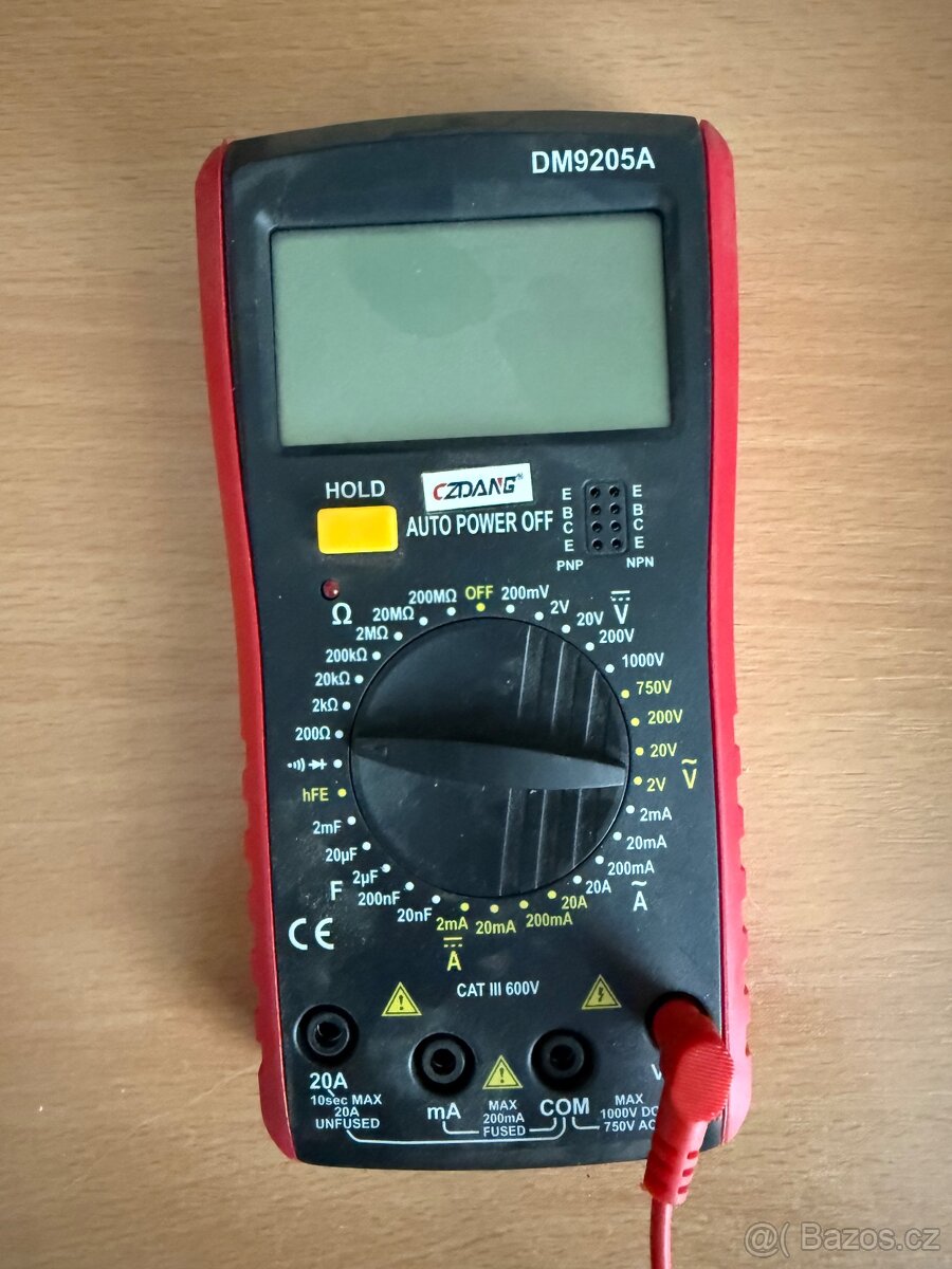 Jedná se o digitální multimetr modelu DM9205A (nebo DT9205A). Tento přenosný, bateriově napájený přístroj se běžně používá pro základní i profesionální elektrické měření v domácnostech, laboratořích a dílnách.