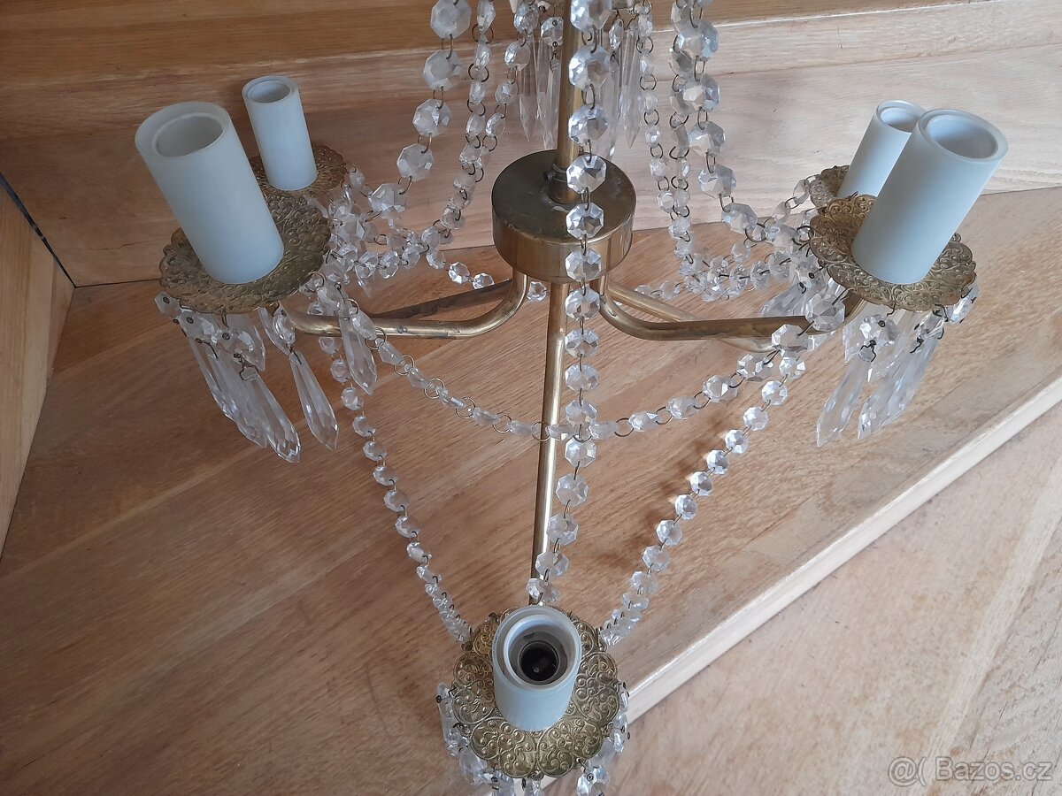 Křišťálový retro lustr - [27.1. 2026]Prodám starý lustr. Stav viz. foto, nález. S jednotlivými svícny lze hýbat do strany. Stropní svítidlo