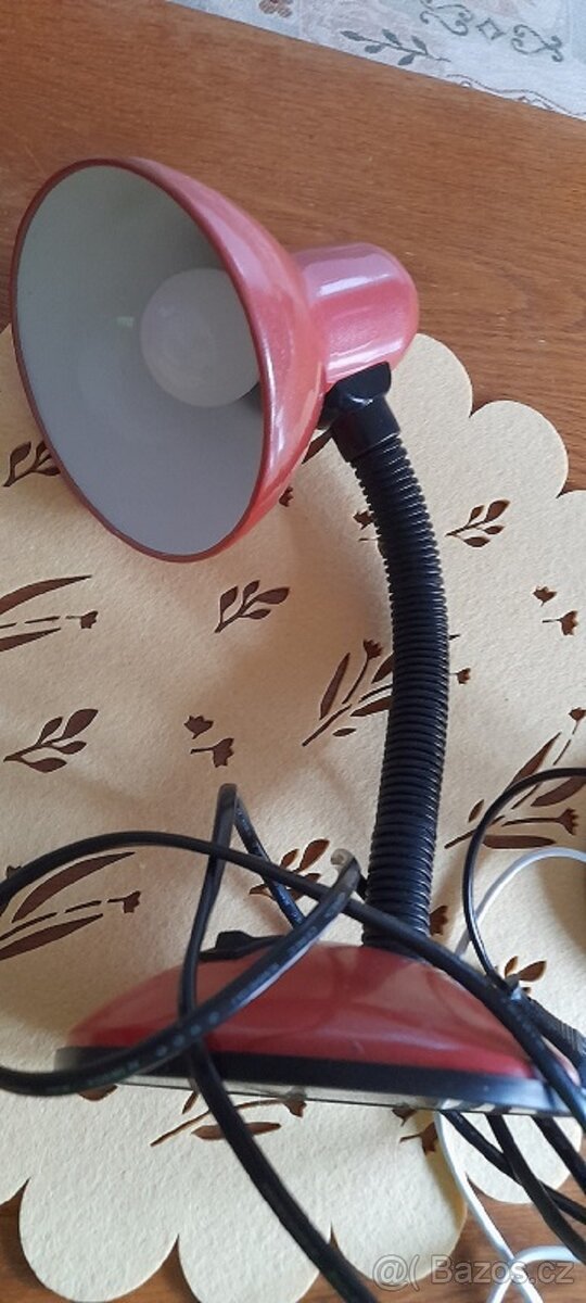 Červená (jakoby metalíza) s vypínačem na podstavci, kovová, závit E27,svítidlo od poloviny ohebné, funkční žárovka,