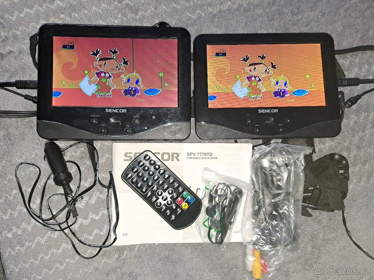 Stav bez poškození, druhá obrazovka nepoužívaná. Součástí je nabíjení do auta i do sítě, sluchátka, náhradní popruhy, návod. DVD se dá přidělat na opěrku hlavy v autě.