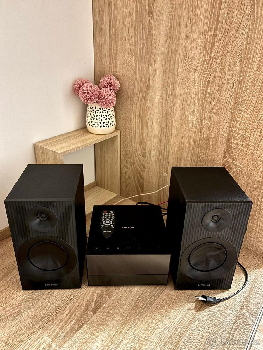 Prodám mikrosystém Samsung MM-J330 v černé barvě. Sestava obsahuje hlavní jednotku + 2 reproduktory + dálkový ovladač (viz foto).