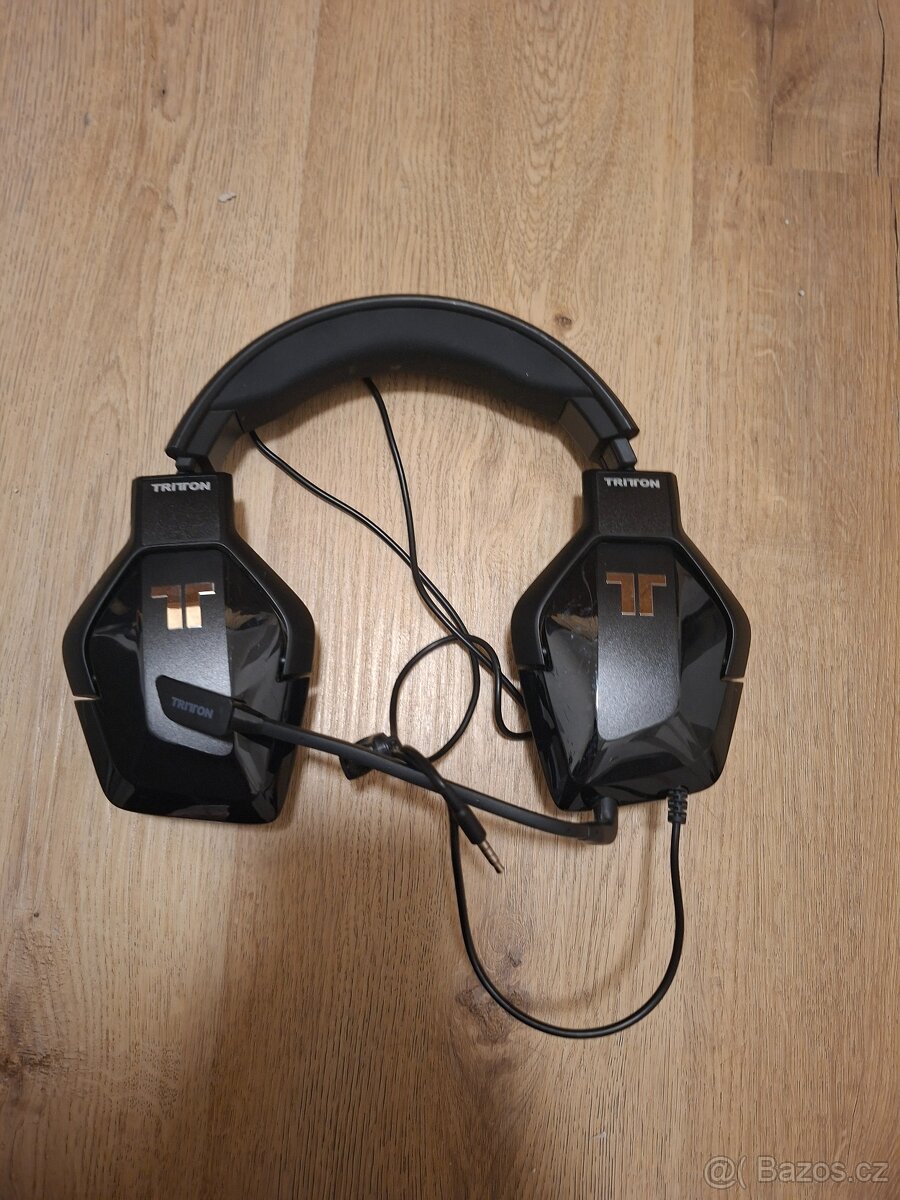 Prodám herní headset Tritton Trigger s klasickým 3,5mm jack konektorem. Sluchátka jsou plně funkční včetně mikrofonu, vhodná pro PC i konzole s jack vstupem. Zvukově stále použitelné, mikrofon funkční.