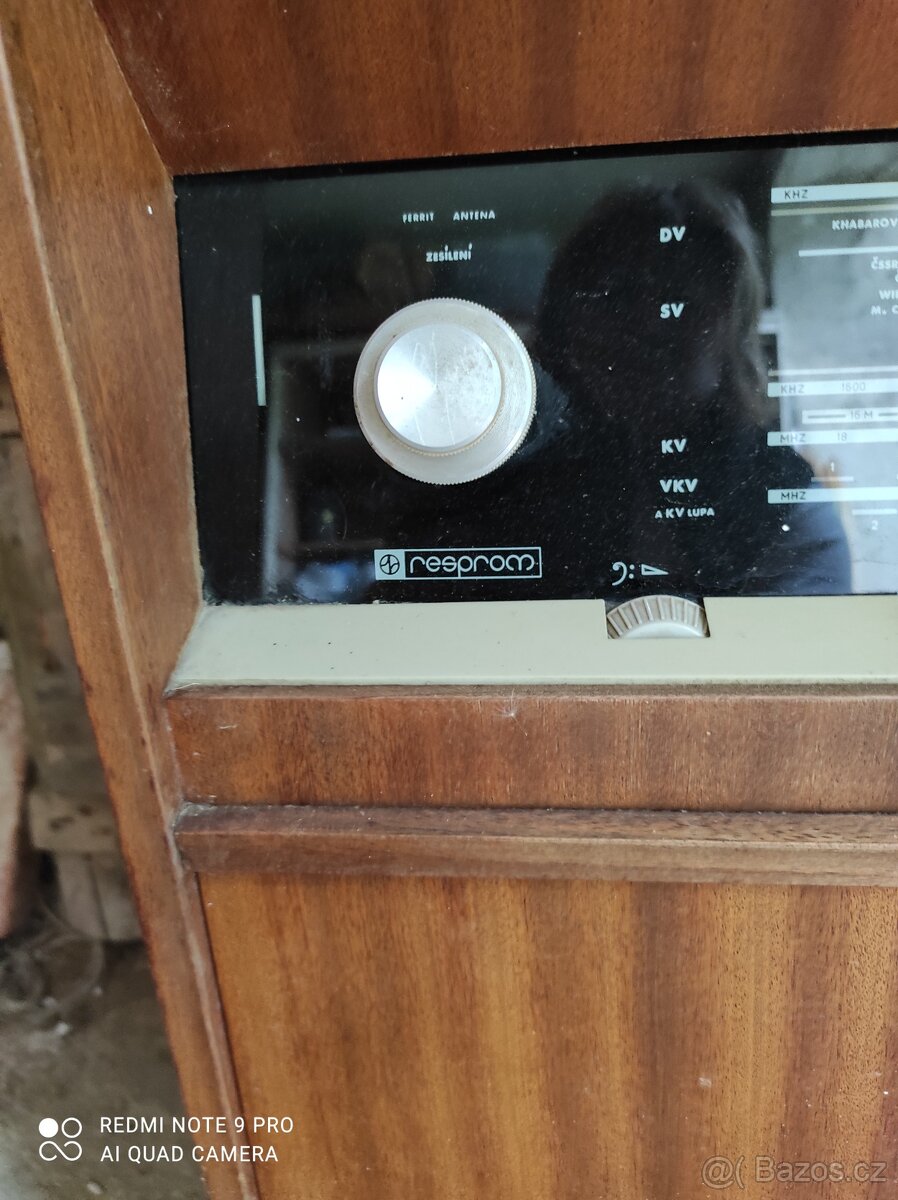 Retro bulharsky elektronkovy radio-gramofon A-104. Nahore odklapeci cast s gramofonem, uprostred radio, ve spodni casti ulozny prostor pro gramodesky.