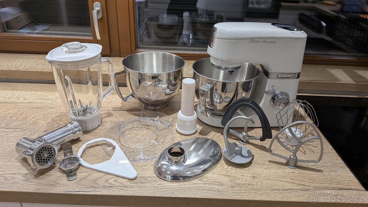 SENCOR STM 6350WH, Multifunkční kuchyňský robot s výkonem 1000 W, asi pět let starý, ale používaný minimálně, plně funkční, v perfektním stavu, široké příslušenství, dokoupenaá druhá nerezová mísa, osobní předání Praha, Kutná Hora nebo Mladá Boleslav
