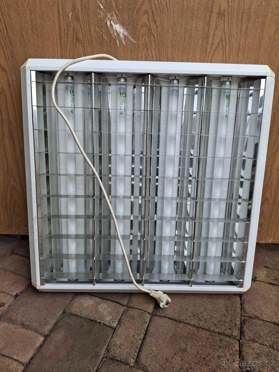 Prodám stropní zářivku Rozměry: dxšxh 66x66x9 se čtyřmi trubicemi. Plně funkční - momentálně předělaná se zástrčkou jako přenosná lampa. Zářivky svítí bíle (na obrázku to vypadá barevné).