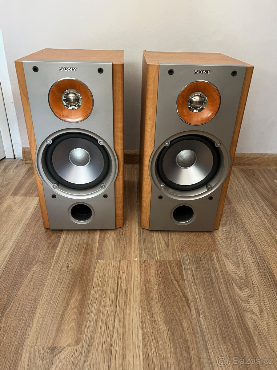 Prodám kvalitní reproduktory SONY SS-NX1. Repro je technicky v naprostém pořádku. Jedná se o 2 pásmovou ozvučnici s basreflexem do předu. Basové závěsy jsou GUMOVÉ od výroby nesmrtelné. Impedance 6 ohmů , výkon 100 W RMS / 160 W hudební výkon. Na jednom reproduktoru ťuklý rožek. Nemá vliv na přednes, zohledněno v ceně. Rozměry V x Š x H / 41 x 21 x 28 cm.