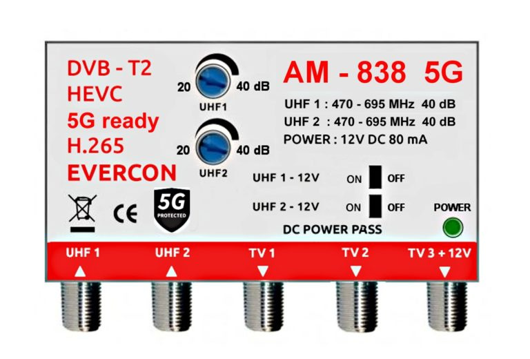 Vysoký zisk jádra zesilovače 40 dB zajišťuje dostatečný signál až pro 10 TV i při delších trasách koaxiálních kabelů.