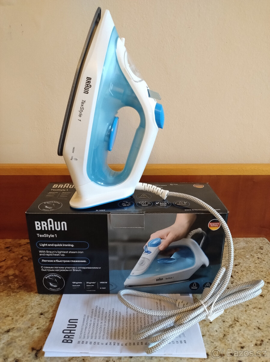 Nová-nepoužitá napařovací žehlička BRAUN TexStyle 1: příkon 1900 W, objem nádržky 220ml s technologií AntiDrip, výstup páry 25g/min, parní ráz 120 g/min, tlačítko pro kropení, žehlicí plocha SuperCeramic s přesnou špičkou, možnost vertikálního napařování, funkce automatické vypínání a úsporného režimu. Cena 580 Kč, jen volat.