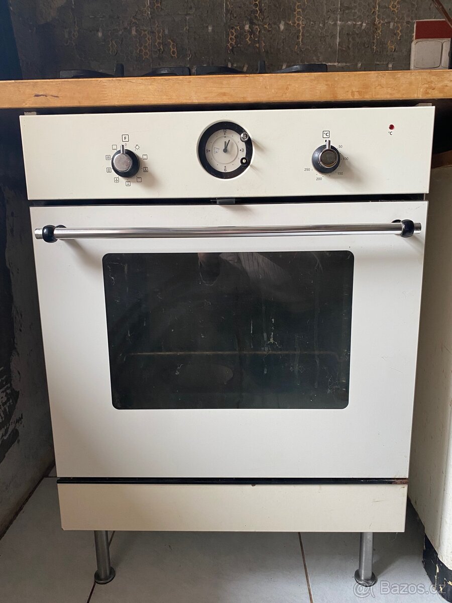 Elektrická horkovzdušná trouba Ikea Datid. Krémová. Rozměry: š 60 cm, hl 58 + 2 cm vč. dvířek, v korpusu bez noh 70 cm, v samotné trouby 59/60 cm, nohy 16 cm. Momentálně je zabudovaná tak, jak je na fotce. Zapojení do zásuvky. Vlastní demontáž. Cena je za troubu, korpus vč. nohou a 2 plechů věnuji zdarma. Vše je potřeba dočistit. Omlouvám se, není v mých silách. Funkčně v pořádku, chybí krytka otočného knoflíku u hodin, kovový rošt zbarvený, zřejmě nepůjde úplně vyčistit. V korpusu je zásuvka na pečicí potřeby. Samotná trouba bude po vyčištění pohledově pěkná, čelo zásuvky je flekaté a kovový lem pod dvířky trouby je na jedné straně orezlý.