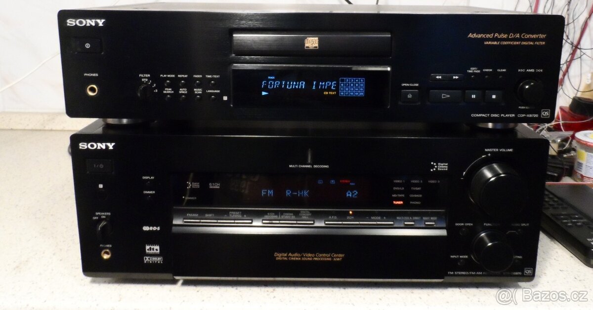 SONY STR-DB870QS 5.1 kanálový AV receiver Sony STR-DB870 s výkonem 5 x 100W. Dekodéry: Dolby Digital, DTS, Dolby Pro Logic, 27 x DSP, FM/AM tuner s RDS-EON, 30 předvoleb,převodníky DA 192kHz/24-bit,možnost připojení repro 4 – 8.Ohm,alu čelní panel,celokovová konstrukce přístroje.Původní MOC byla:22000Kč.SONY CDP-XB720QS CD přehrávač se zajímavým přepínačem tří různých zvuk.digtálních filtrů,Hi-Fi zvuk,CD text v různých jazycích,alu.čelní panel,celokovová konstrukce přístroje,CD laser běžně dostupný SONY KSS-213.Výstupy digitál: coax a optika.Původní MOC byla:11000Kč.Sestava je plně funkční a pochází z nekuřáckého prostředí.Celková cena sestavy byla:33000Kč.