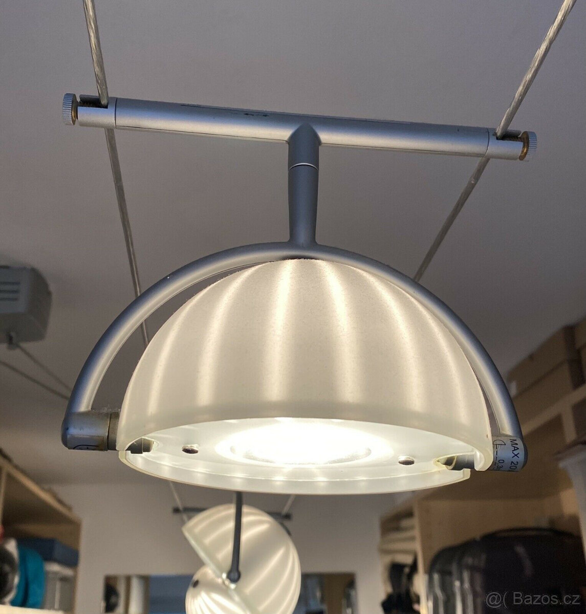 Systém má 5 bodových nastavitelných svítidel v kombinaci hliníku a foukaného skla. Rám i držák stínidla v plastu ve stříbrné barvě.