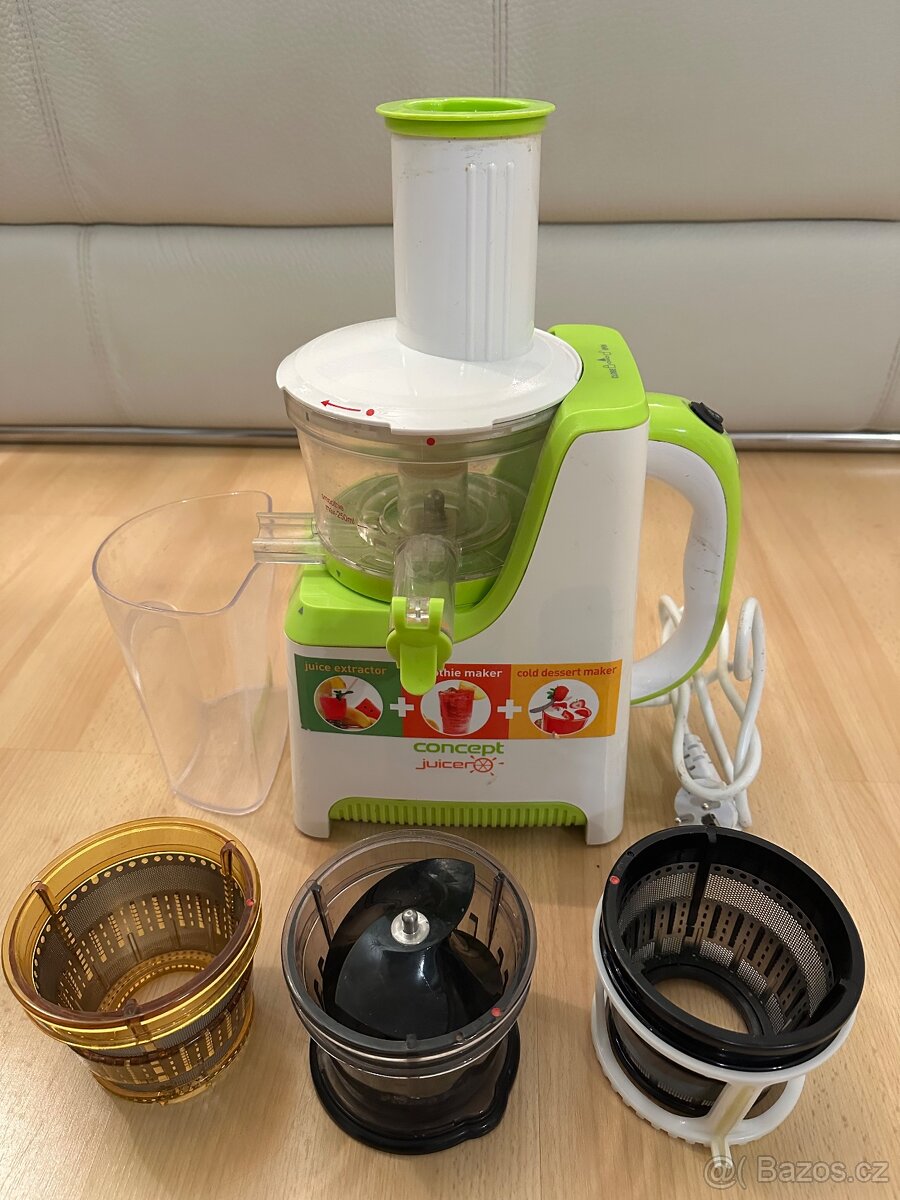 Prodám skoro nepoužívaný nízkootáčkový dvoufázový odšťavňovač se systémem proti odkapávání. Tichý chod 75 dB, příkon 150 W, objem nádoby na šťávu 1,25 l, objem nádoby na dužinu 1,8 l. Plně rozebíratelný, lze snadno umýt. Včetně návodu na použití.