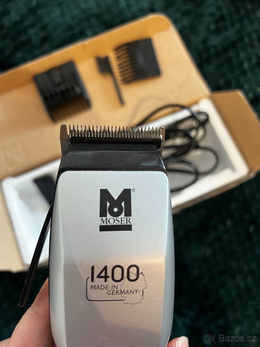 Prodám elektrický zastřihovač vlasů. Je v dobrém stavu, doma málo používaný. Všechno funguje perfektně a bezchybně. Zastřihovač Moser 1400 je vyroben v Německu. Dodává se se dvěma nástavci: jeden má délku 4,5 mm a druhý od 4 mm do 18 mm (přepíná se páčkou: 4, 6, 9, 11, 13, 16, 18 mm).