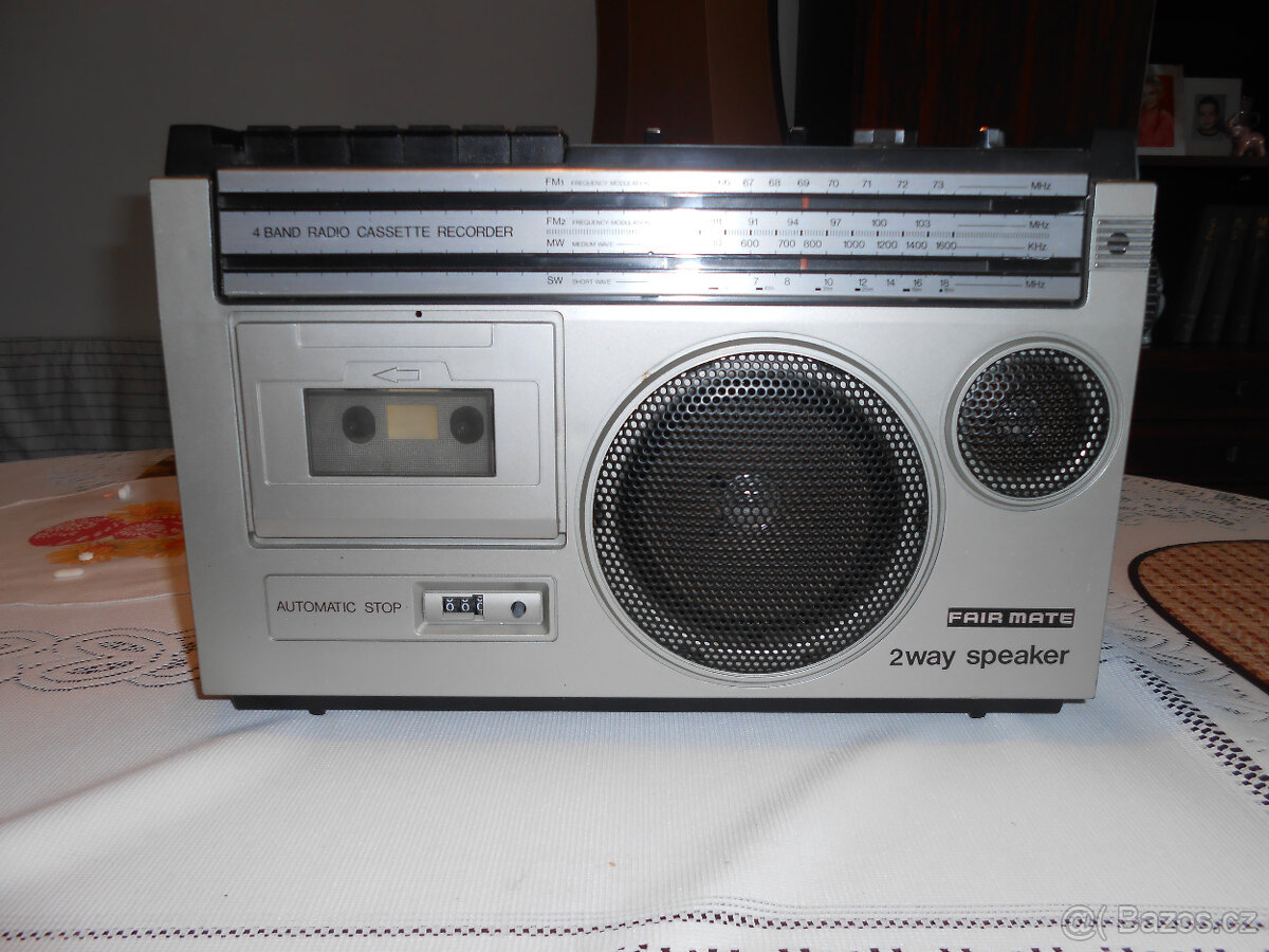Prodám hezký vintage čtyř-pásmový radiomagnetofon FAIR MATE (ASAHI) CR-360 z roku 1972. Přístroj je opticky velmi hezký, čistý. Rádio ladí, kazeta hraje i přetáčí. Jedinou drobnou závadou je chybějící anténa, ale na fungování tuneru to nemá velký vliv. Rozměry 360x240x100mm, hmotnost 2,8kg.