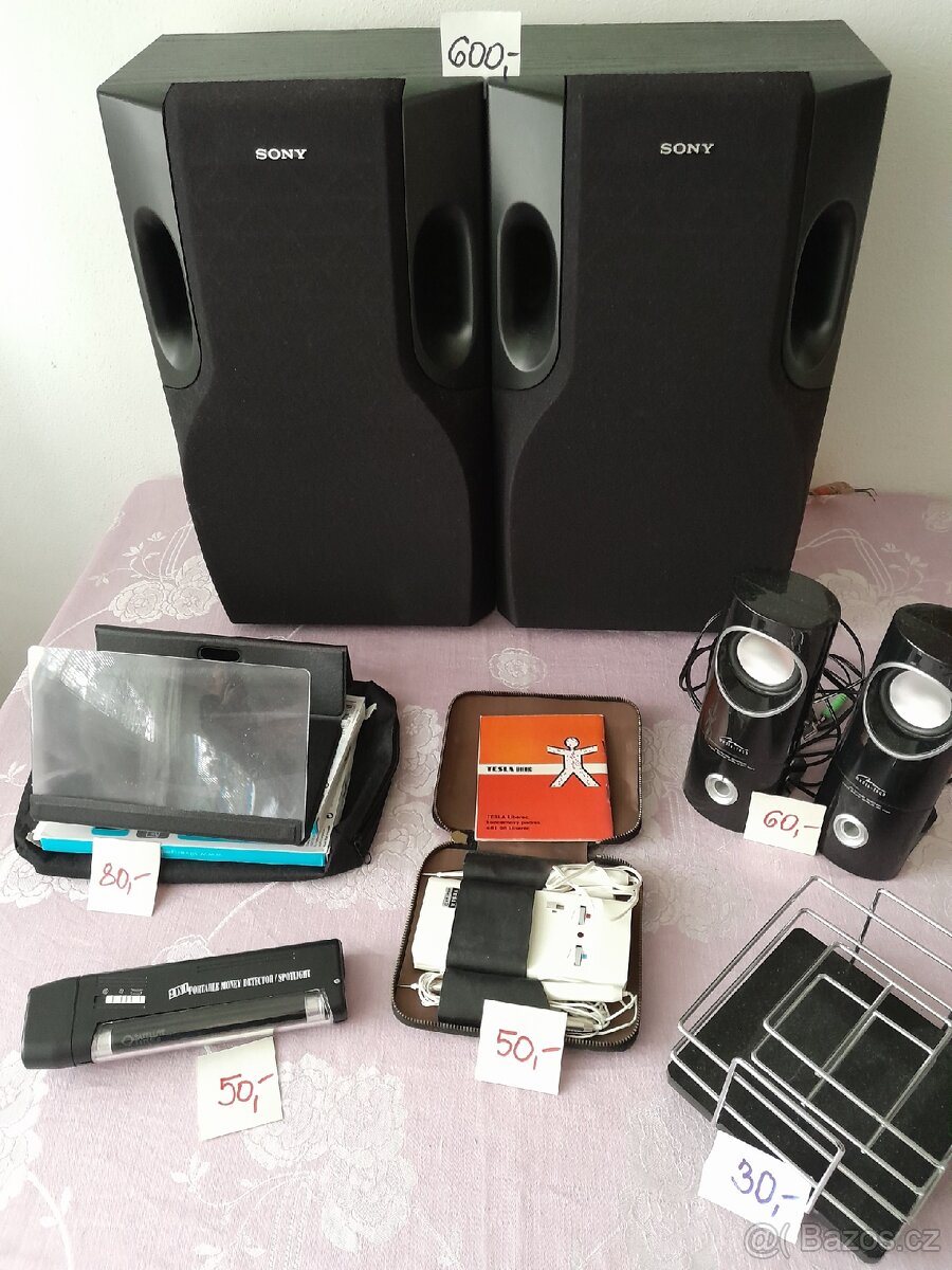 2 překapávače na kávu a čaj 50 a 100 Ķč, 2x repro Sony 25x22x43 cm, 6 ohmů, 100W 600 Kč, 2x repro k počítači Media tech USB 60 Kč, lupa na mobil 2x à 80 Kč, stimul 3 je již prodaný,