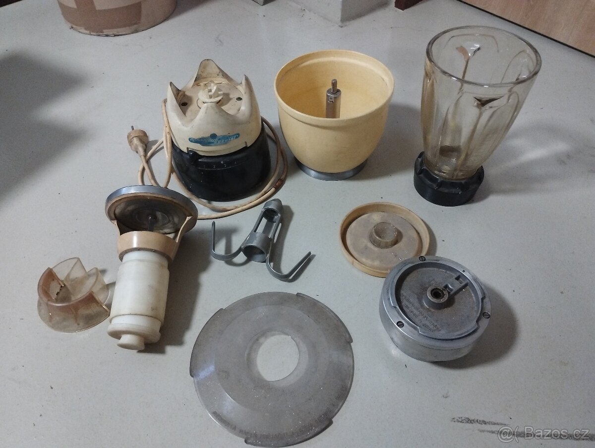 Prodám retromixer Pragomix z 60. let. Spíš na ND, funguje od třetí rychlosti. Součástí je stroj, mixér, mlýnek na kávu a hnětač. Dlouhodobě uskladněno, nemyto. Cena za komplet, jak je to na foto. Osobní převzetí, případně zaslání s platbou na účet předem (500 + poštovné).