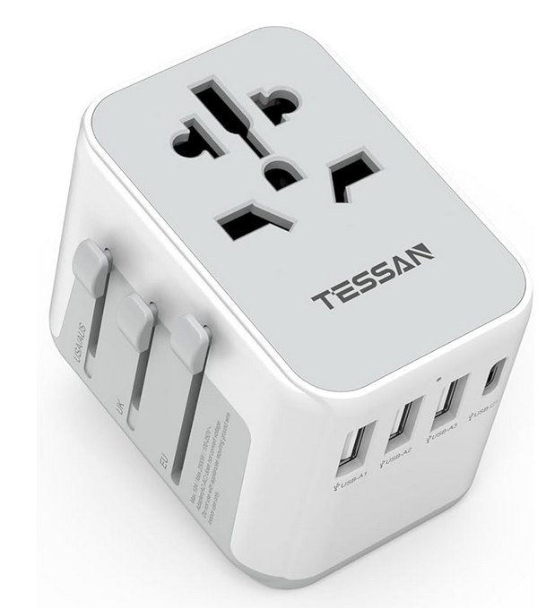 Cestovní adaptér do celého světa se 4 USB a 1 AC portem: 3 porty USB A (5 V, 2,4 A max.), 1 port USB C (5 V, 3 A max.) a 1 AC zásuvka (podporuje 100–250 V, 50–60 Hz, nabíjení 10 A max.). Výkon: 2500 W při 250 V AC, 1100 W při 110 V AC. S tímto mezinárodním adaptérem do zásuvky můžete nabíjet 5 zařízení současně.