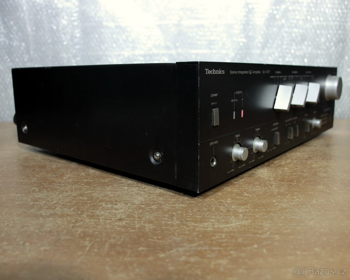 Výborný stereo zesilovač Technics SU-V 707, výrobek tradičního japonského výrobce špičkové HiFi techniky. Poctivá konstrukce, hliníkový čelní panel, zapojení koncového stupně ve třídě A, oddělený obvod předzesilovače a koncového zesilovače (umožňuje snadné připojení ekvalizéru atd.), množství užitečných funkcí včetně předzesilovače pro MM a MC přenosku gramofonu. Příkon max. 510W, dynamický výstupní výkon 2 x 120W, trvalý 2 x 90W (DIN, do 8Ω), zkreslení THD 0,003% (do 8Ω), odstup šumu 104dB (IHF-A), gramofon 88 / 72dB (MM / MC), kmitočtový rozsah 1Hz – 140kHz (-3dB), doporučená zátěž 4 - 16Ω, 5x vstup (vč. gramofonu), výstupy Rec, Pre-Out, na sluchátka, rozměry 43 x 12 x 37cm, hmotnost 10kg. Plně funkční, dobrý stav (drobné známky používání), perfektní zvuk ve všech režimech. Původní otočné repro terminály byly nahrazeny klasickými pružinovými. Další info v manuálu v pdf (mohu poslat emailem).