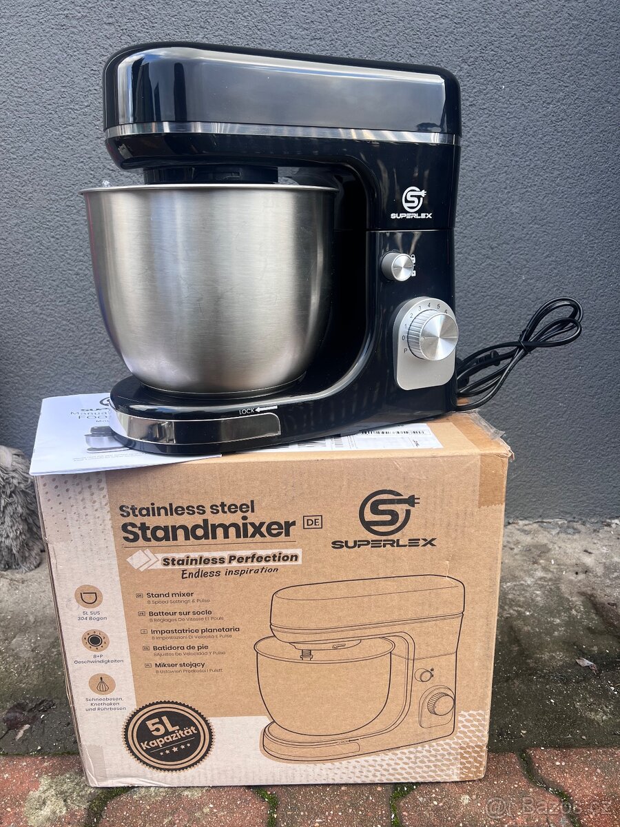 Stojanový mixér SUPERLEX o výkonu 1300 W má objem 5 litrů a je vybaven multifunkčním příslušenstvím, jako je hnětací hák, šlehací metla a míchací čepel. Má 8 nastavitelných rychlostí a snadno si poradí jak s lehkým mícháním, tak i s hnětením těsta.