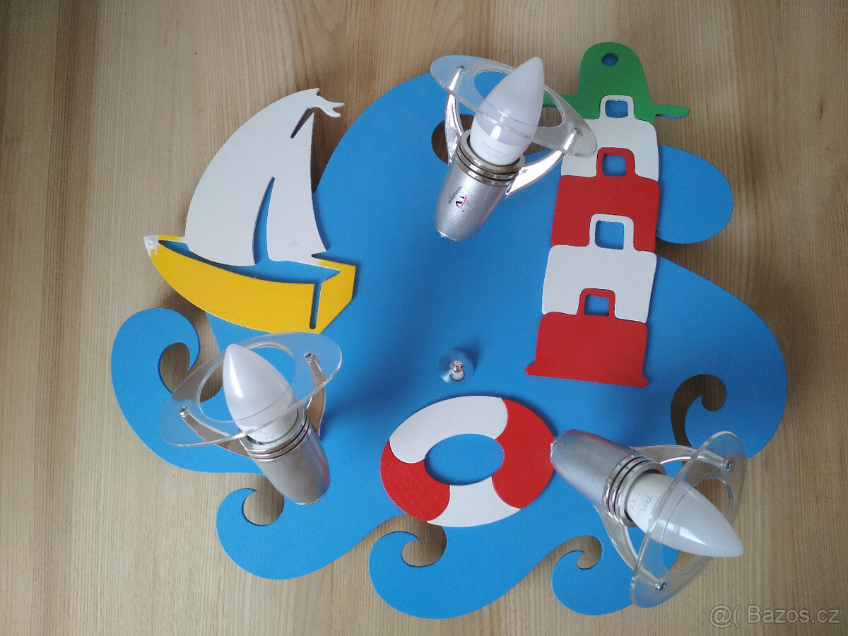 Prodám dětský lustr s námořnickým motivem, bez zjevných vad. Osazen třemi paticemi E 14 mignon. Cena 250Kč Vysočina a V. Čechy.