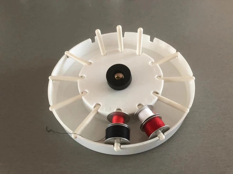 Zcela nový, nepoužitý otočný zásobník až na 24 ks cívek do šicího stroje. Přehledné umístění cívek s různými nitěmi. Jednoduchá montáž na pracovní desku šicího stroje. Včetně montážní sady. K dispozici více kusů.