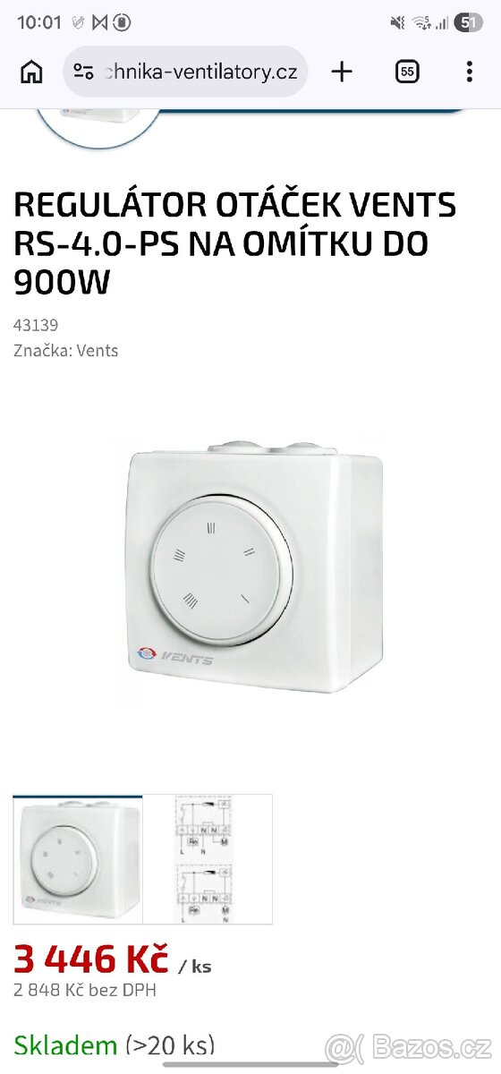 Prodám nevyužité regulátor otáček k ventilátoru (Regulátor otáček Vents RS-4.0-PS na omítku do 900W)