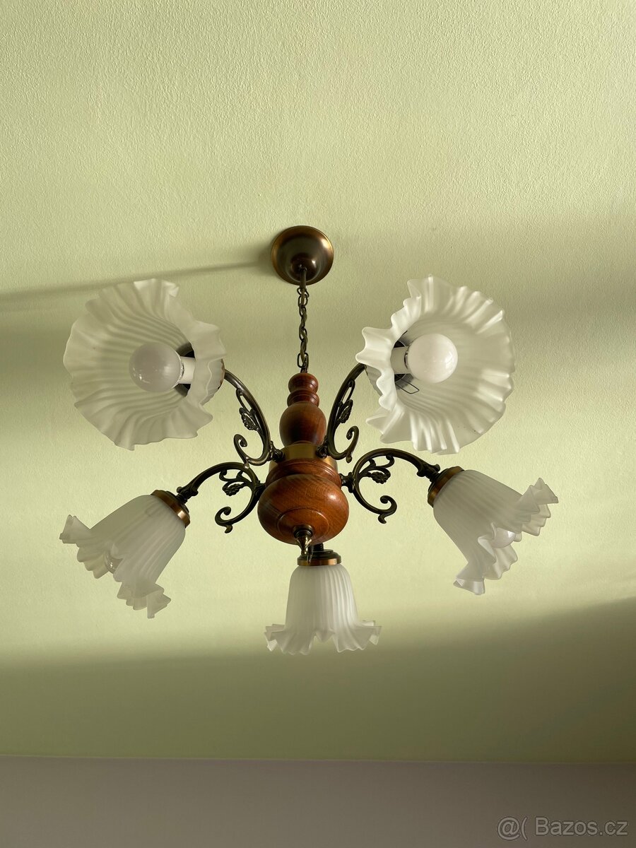 Prodám rustikální pětiramenný lustr ve velmi dobrém stavu. Materiál dřevo, kov a sklo. Součástí lustru je 5 ks úsporných žárovek (pokud o ně nemáte zájem odečte se z ceny 300 Kč). Napájení je 220V.