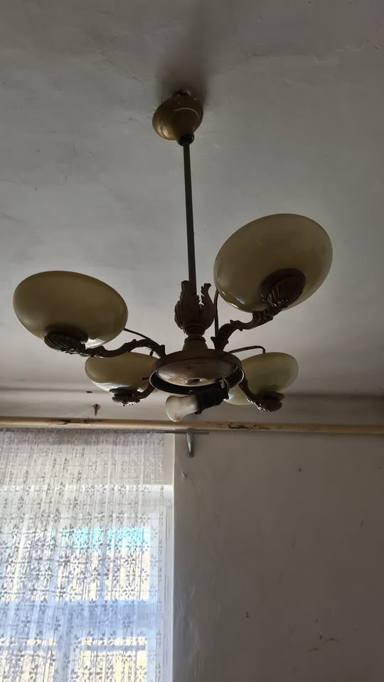 Starožitný retro lustr. Lustr je kovový, pozlacený, 4 skleněné misky jsou v pořádku, chybí jeden skleněný kryt.